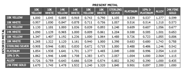 To use this grid, locate intersection of desired metal and present metal. This number is your conversion factor. Multiply that number by actual known weight of present metal, e.g., to determine what an item that weighs 1.50 dwt in Sterling would weigh in 14K Yellow, go to 14K Yellow under Desired Metal column. Follow that row across until it intersects the Sterling column. This is your conversion factor (in this case 1.248). Then multiply that number 1.248 (conversion factor) by 1.5 (known weight) = 1.872 dwt. This would be the weight for the 14K Yellow item.